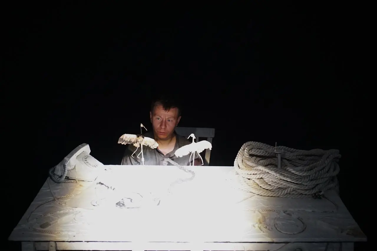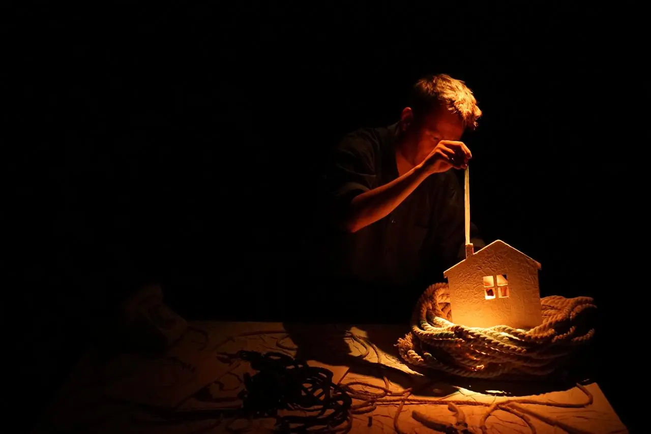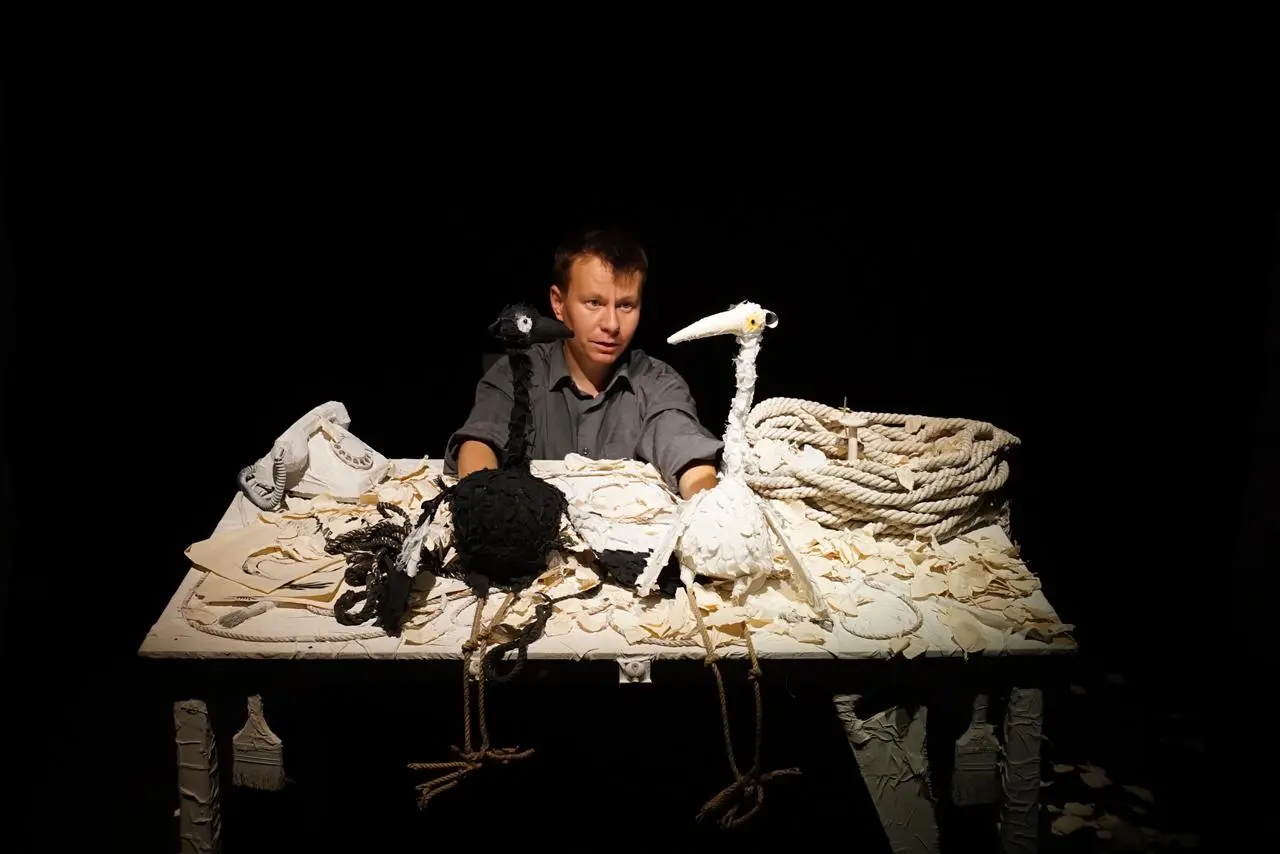 Заттар, қағаз, арқандар, маталар спектакльде қызықты пішіндер жасау құралына айналып, басты кейіпкердің әлемінде бұл пішіндер тіршілік табады.